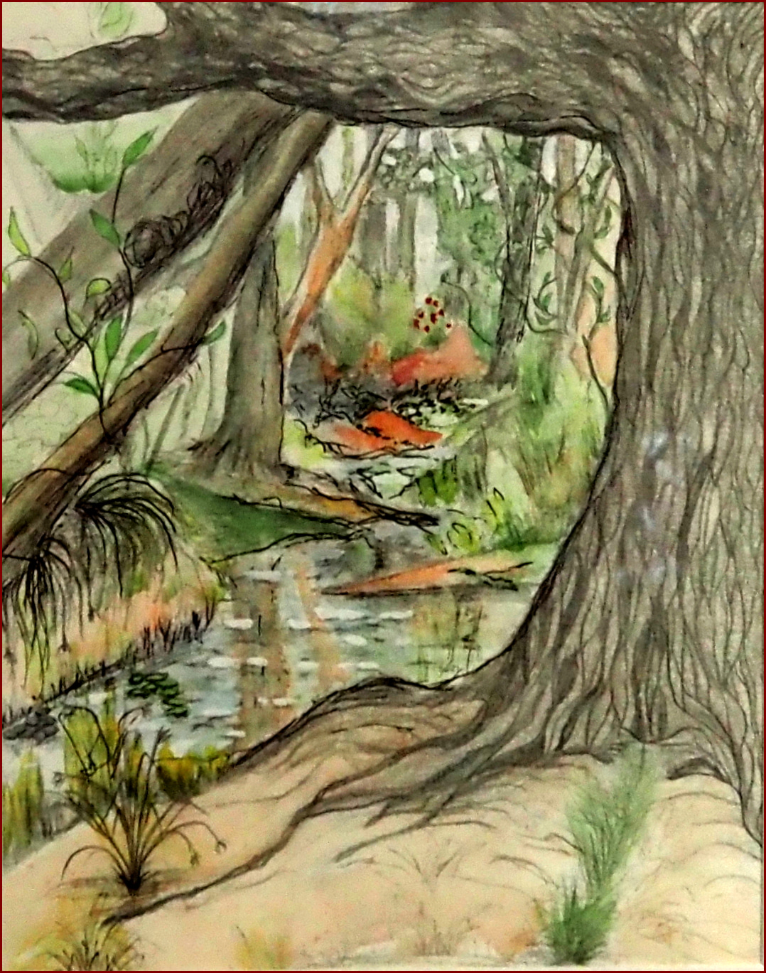 03 'Through the Trees' - Danielle Bain, Ink & Watercolour, 21x30cm, Framed, $80