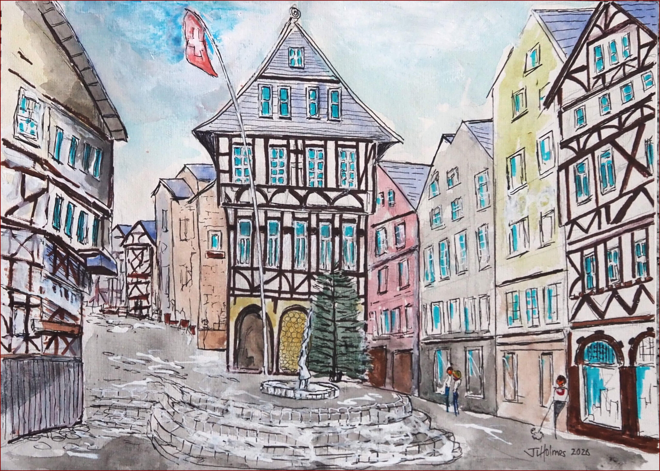 10 'Eisenmarkt Wetzlar' - John L Holmes, Ink & Watercolour, 59x42cm, Framed, $150
