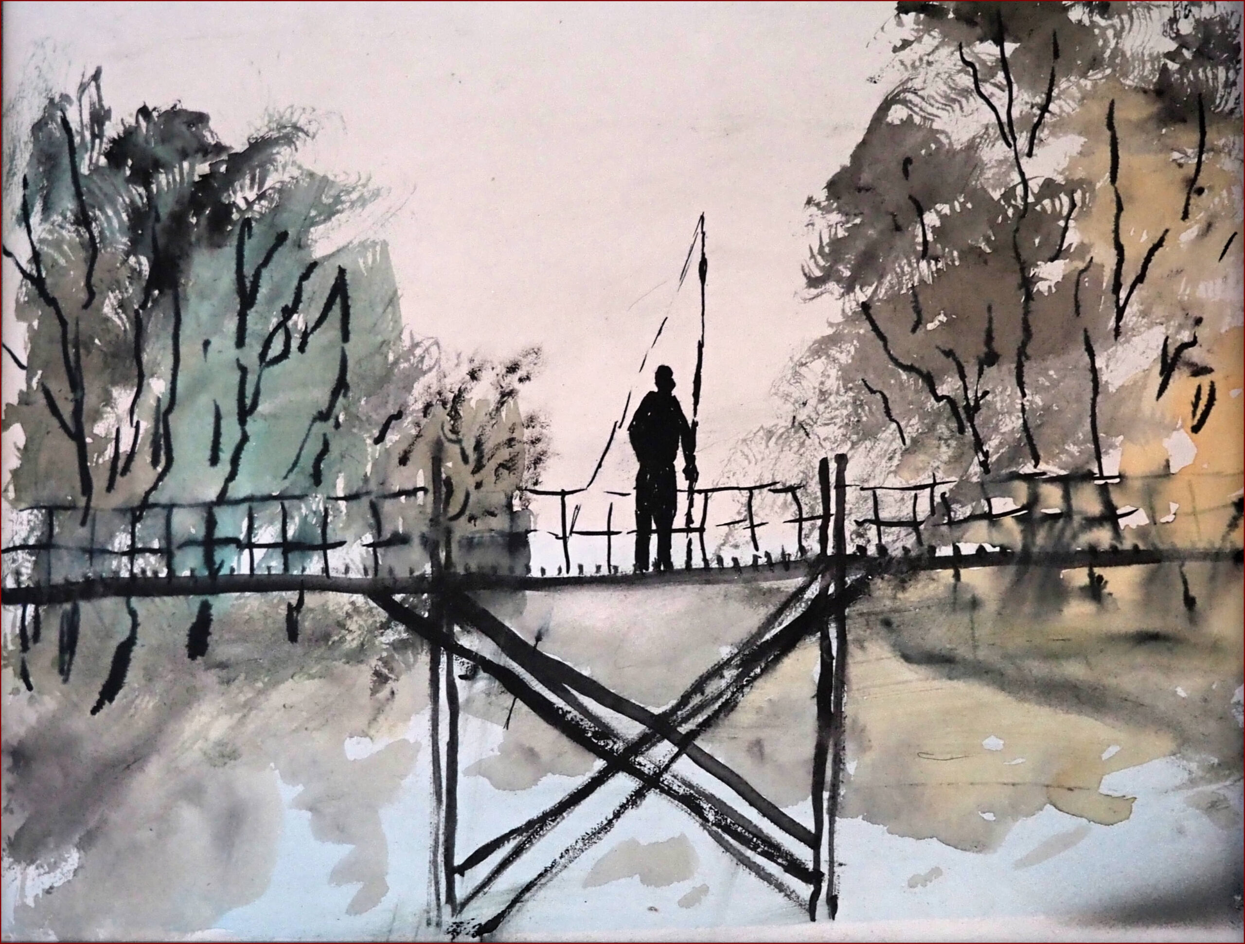 14 'Bridge Fishing' - Ray Hackett, Watercolour, 47x35cm, Framed, $80