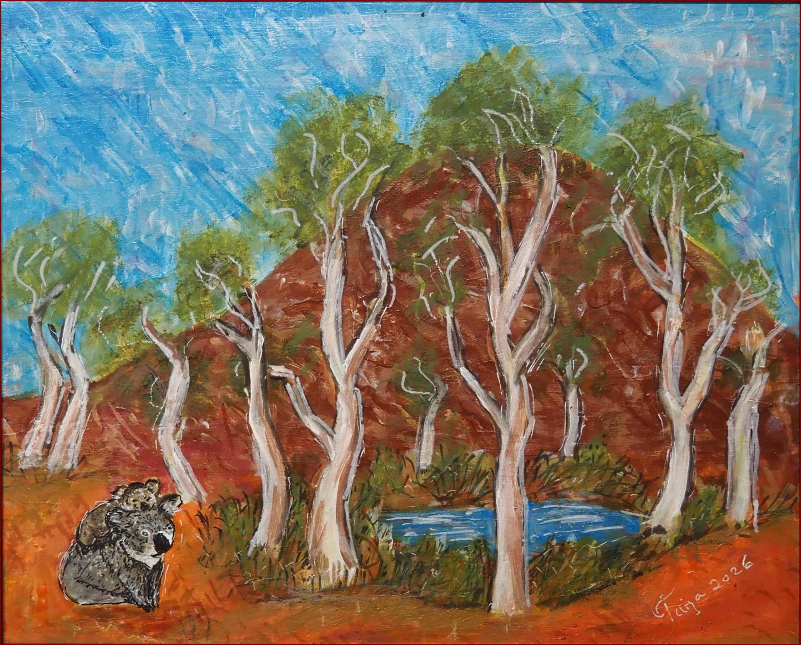 08 'Koalas at Waterhole' - Tarja Rantala, Acrylic, 40x33cm, Framed, $120