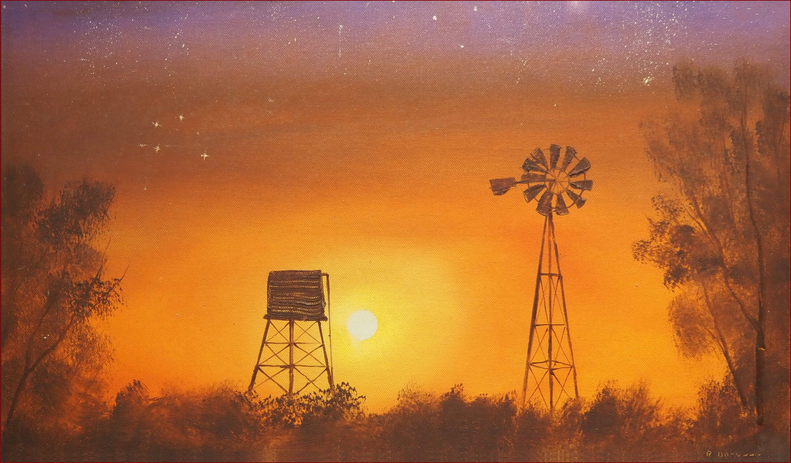 12 'Sunset on the Farm' - Ray Hackett, Oils, 40x37cm, Framed, $200