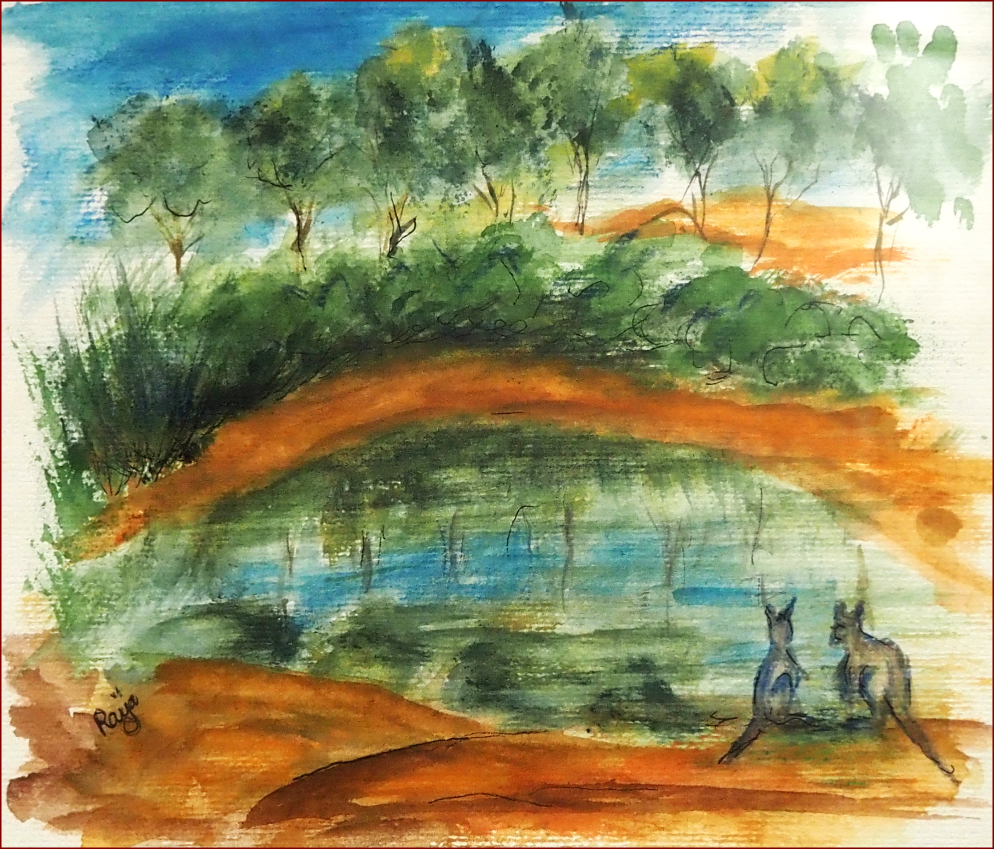 14 'Outback Waterhole' - Raija Jantti, Watercolour, 24x19cm, Framed, $80